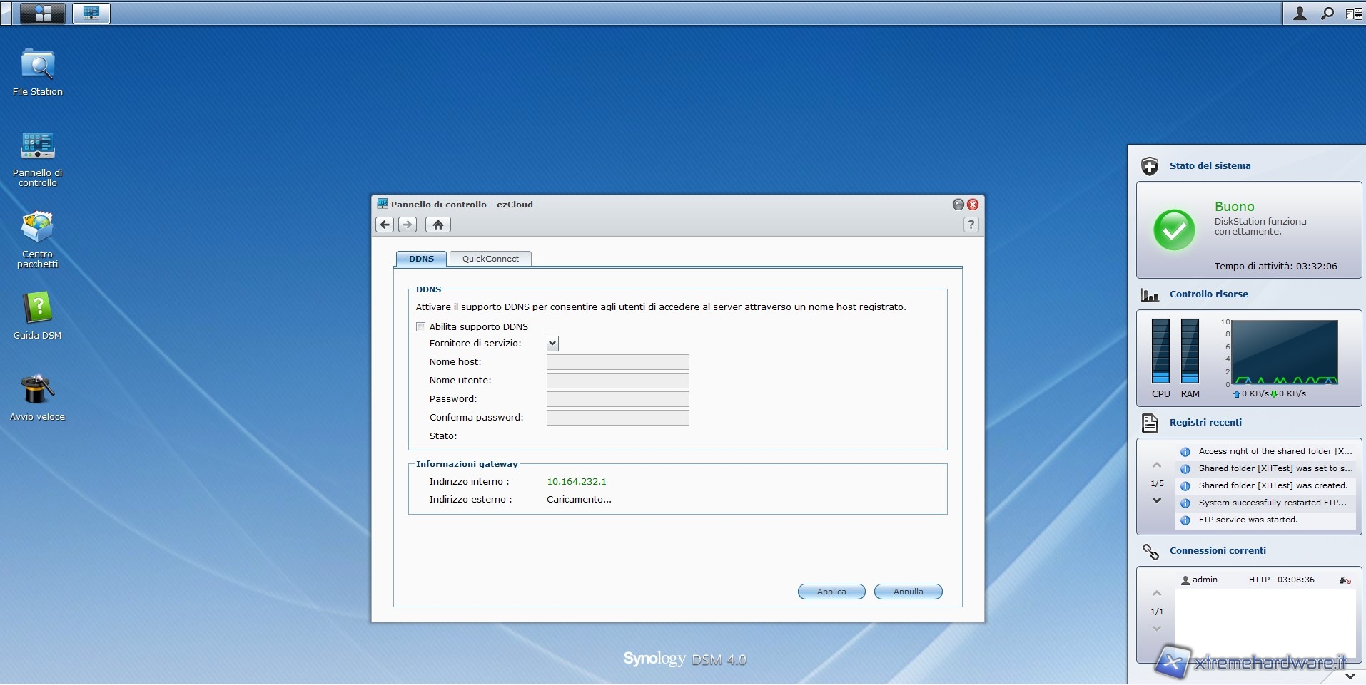 La registrazione del proprio indirizzo IP esterno presso un host name permette il cambio automatico di indirizzo IP sul sito dell’host, che continuerà a puntare al DS212j aggirando il problema dell’IP dinamico che caratterizza la maggior parte delle reti attuali; solitamente questa operazione richiede anche un fowarding delle porte sul router al quale è connesso il NAS.